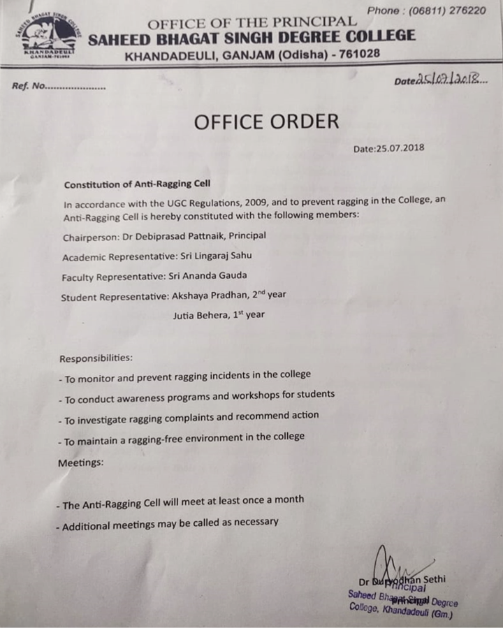 Saheed Bhagat Singh Degree College As per the provisions of the R.T.I Act , 2005 (Act No.22) of the Govt. of India and at the direction of the Government of State of Odisha (H.E. Department) the college being a government aided institution has appointed a Public Information Officer (P.I.O) who is the authorized agent to receive application for information as stipulated in the Right to Information Act. The P.I.O holds office at the pleasure of the Principal who heads the college and processes the application / information to be received by the applicant. He /She is authorized to ask different sections of the institution to supply the information (if permissible by RTI) sought by the applicant.